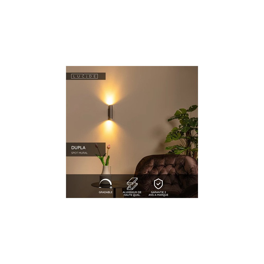 Donnez un look moderne à votre intérieur avec le spot mural Lucide DUPLA. Cette applique élégante, fabriquée en aluminium de haute qualité avec une finition subtile, dégage une élégance minimaliste. Grâce à son éclairage uplight et downlight, le DUPLA crée une lueur chaleureuse et accueillante, idéale pour votre salon, couloir ou chambre. Avec son système innovant de douille mini GU10, ce design est très fin et moderne, tout en permettant d'utiliser des ampoules LED indépendantes. Commandez rapidement ce spot mural pour un effet saisissant, mais vérifiez bien si le design fin s'adapte à votre installation.